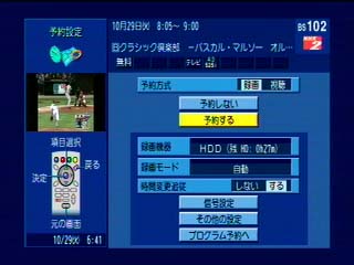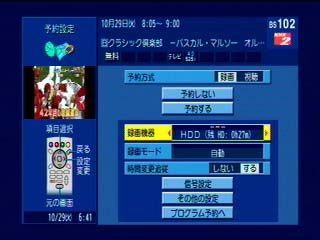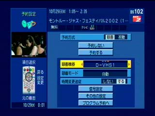 予約画面です。 D-VHSがあれば録画機器のところが HDDとD-VHSの選択ができます。 |