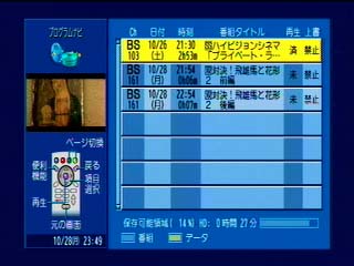 予約一覧です。 左はHDD,D-VHS1など録画機器 その次に予約番組の録画が済んだかどうかの表示。 あとは、CH、日付、時刻、番組名です。 |