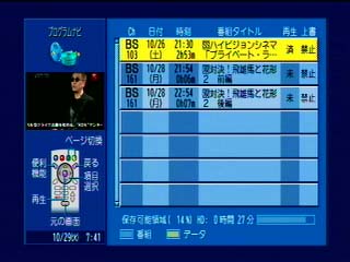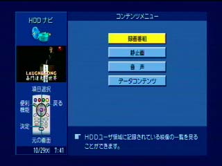 例としてHDDに録画した「プライベート・ライアン」をD-VHSにダビングしてみます。 ちなみに「プライベート・ライアン」をいれたあとのHDD残量はHDで約30分です。 メニュー>機器ナビ>HDDナビ |