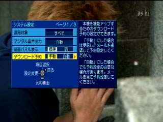 衛星経由でシステムのアップグレードをする方法です。 私は,ダウンロード予約の設定は手動にしていました。 ダウンロードの予約の設定とは, 自動設定だとアップグレードは勝手に行います。 手動設定だとアップグレードするかしないかを選択できます。 しないときは、アップグレード予約を「しない」に設定します。 |