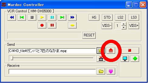| 3:パソコンに取り込んだ素材をD-VHS(HM-DH35000)へ送りHM-DH35000のD端子で鑑賞できる。 これにはMurdocCtrl.exeというソフトを使います。 このソフトで、素材ファイルを選択しアップロードします。 ![]() HM-DH35000の入力をパソコンにします。うちではパソコンはI-3になっています。 これだけです。 もちろん、録画ボタンを押せば録画も可能です。iLINK経由の録画です。 |
