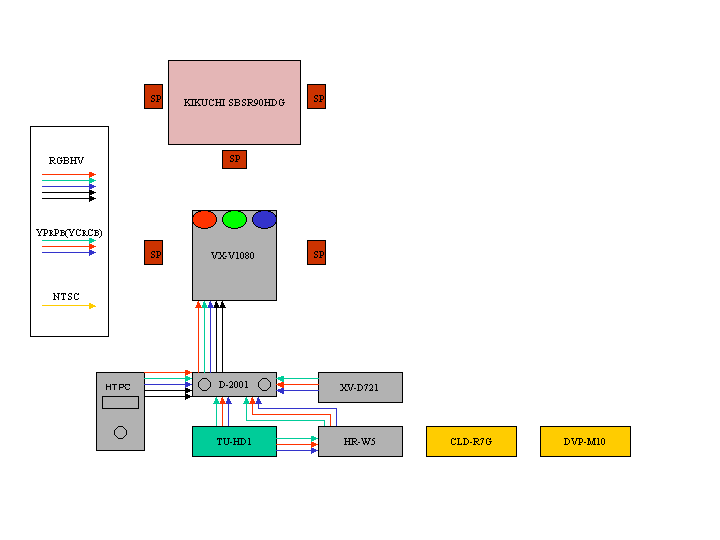2002/05/25 現在 2001/10/30 からの変更点 ラインダブラーDVDO引退。これにともない,LDプレーヤーCLD-R7G,DVDプレーヤーSONY DVP-M10孤立。 プログレッシブDVDプレーヤー VICTOR XV-D721導入。 HTPC正式導入。 D-2001とプロジェクタVX-V1080の結線をカナレ同軸ケーブルV5−5CFB,長さ8mに変更。