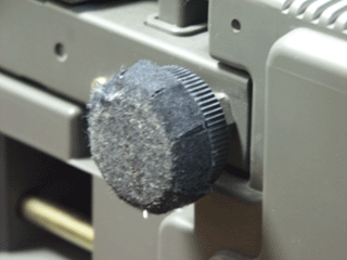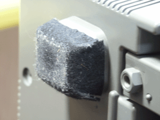 プロジェクタは約60kgあります。 これを,フローリング床の上をすべらせるために プロジェクタの脚に フェルト(片面シール)を貼ってあります。 これは後ろ脚で高さ調節無しです。 |