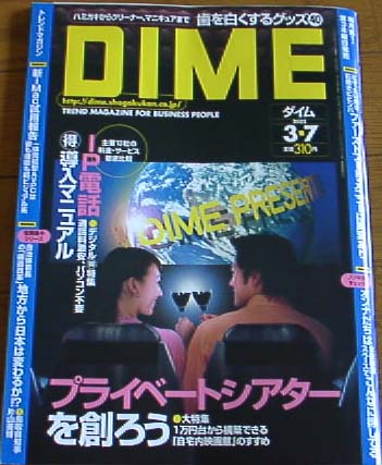 | 2002/02/23 | 電車の吊り広告で,DIMEがホームシアターを特集していることを知る。 早速、購入。 「ホームシアター」ではなく、「プライベートシアター」という用語を使っている。 内容は、取り立てて新鮮な物はなかったが,そこそこの値段でデザインが優れている機種が多いのがよくわかった。 背の高い、細ーいスピーカーが多いのが特長。 三管は出ていませんでした。 20年前は,30cm3ウェイが流行ったものだが、今ありませんね。 |