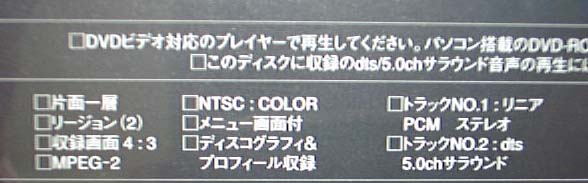 | 2002/02/19 | DVD-AUDIOのお話。 DVD-AUDIO用のソフトには、従来のDVDプレーヤーで再生するときのためにドルビーデジタルなどで音声トラックが用意されている。 先日購入した「HOME COMMING(AMERICA)」には、dts5.1chの音声まで入っている。 このdts音声が、うちのXV-D721で再生できない。 どーしても、できないのでビクターさんにメールで問い合わせてみた。 すぐに返事があり、DVD-VIDEO用の音声はDVD-AUDIOプレーヤで再生できません。 ということだ。さらに、松下さんやパイオニアさんでも同じことです。 とまで、かいてあった。 ほんまかいな?ということで、 パイオニアさんの掲示板で聞いてみることにしました。 |