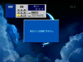そうして、HDDの録画ボタンを押します。 すると、 「現在の入力は録画できません」 と表示されます。 D-VHSからHDDへのコピーはできないようです。 |