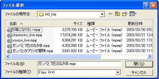 | まずは,この画面を見てください。 これは、WindowsXPでパソコンのHDDの中のファイルを選択しようとしているところです。 ファイルを選択しボタンを押せばVictor D-VHS HM-DH35000の映像端子からハイビジョンの映像が出てきます。 音声も出てきます。 5.1ch放送の場合は5.1ch音声で視聴できます。 ファイルの中でchemistry_live.mpgとあるのは、BS-hiで放送していた「ケミストリーアコースティックライブ」90分です。 この番組は5.1ch放送でした。 おまけに、ミュージックカクテル(30分)も付いています。 よって、90+30分の番組のファイルが約18Gbyteですね。 ザクッと計算して約20Mbpsということになります。 (計算式) ファイル容量(bit) 18x1000x1000x1000x8 転送レート=----------------=----------------------=20000000bps=20Mbps 時間(SEC) 120x60 ご覧のように、こんな感じでパソコンからハイビジョン放送を再生できるのです。 ![]() ![]() |